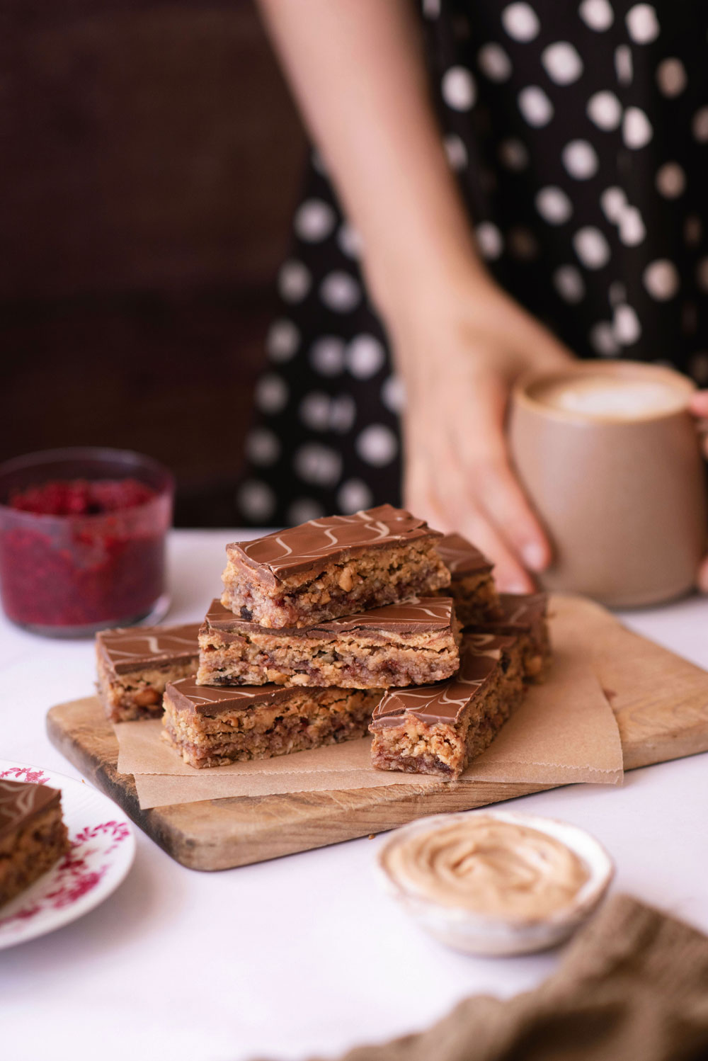- Preko granola smese rasporedite džem pa preko džema dodajte drugu polovinu granola smese. Pecite na 180°C narednih 20 minuta ili dok površina ne porumeni. Dok je sve još vruće premažite površinu kikiriki puterom pa ostavite da se sasvim ohladi.